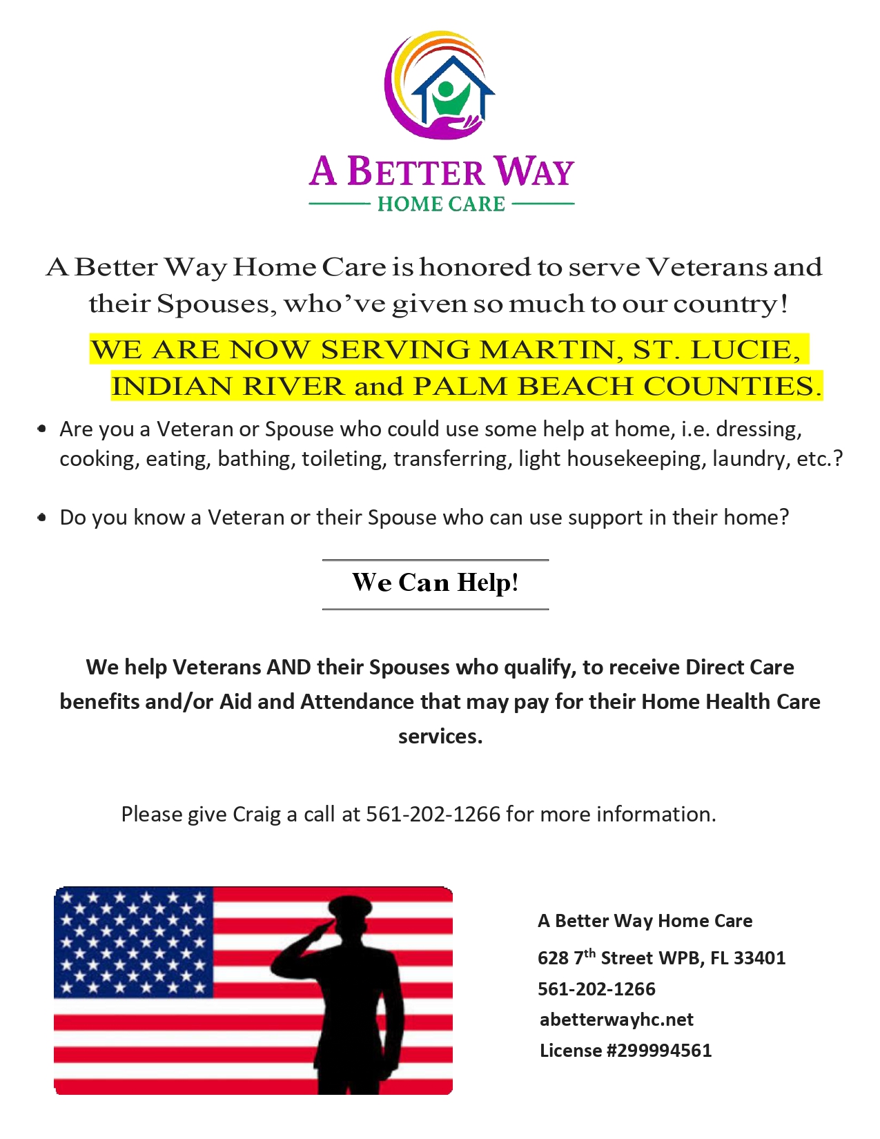 We help Veterans and their Spouses who qualify, to receive home health services paid for by the VA. These may include direct benefits, respite care and aid and attendance. Please contact us at (561) 202-1266 for more information.